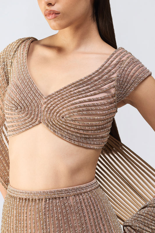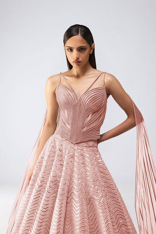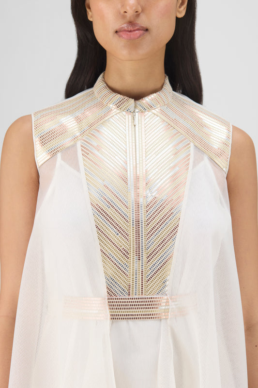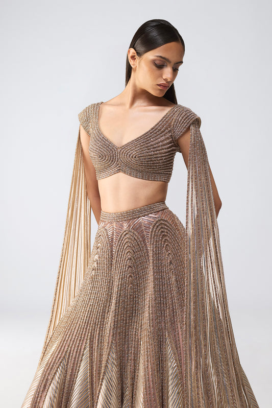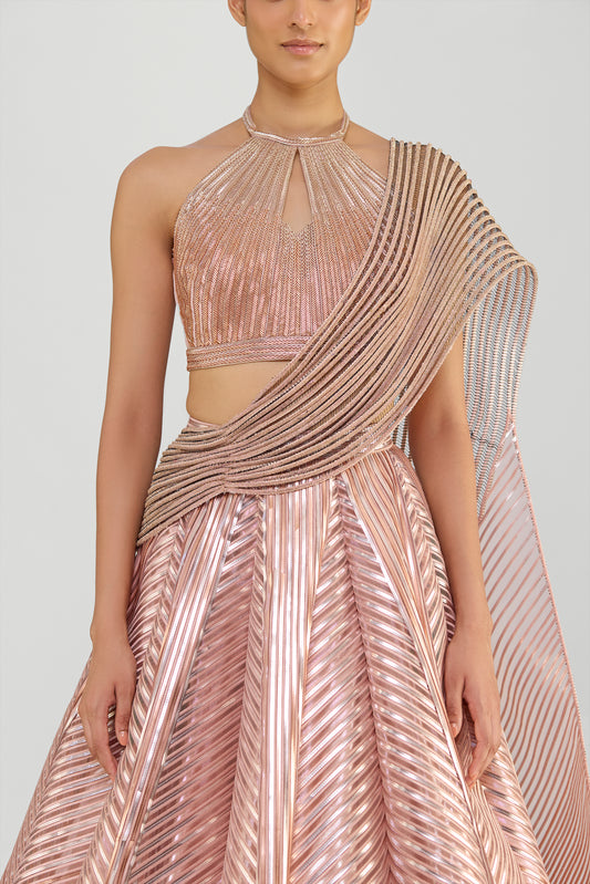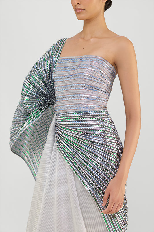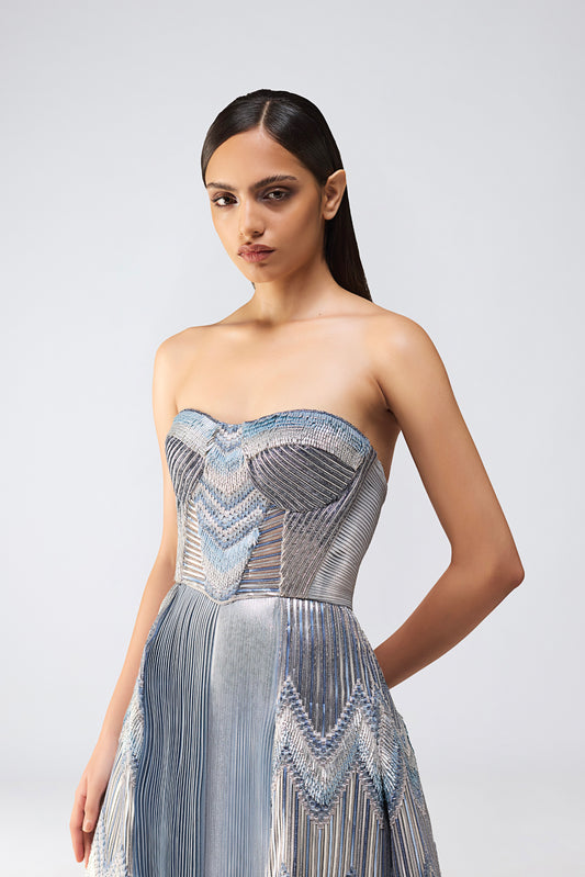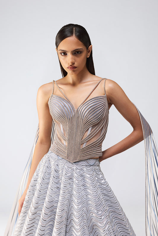 Metallic Fluted Tulle Skirt With A Beaded Halter Top And Crystalvein Drape