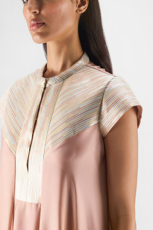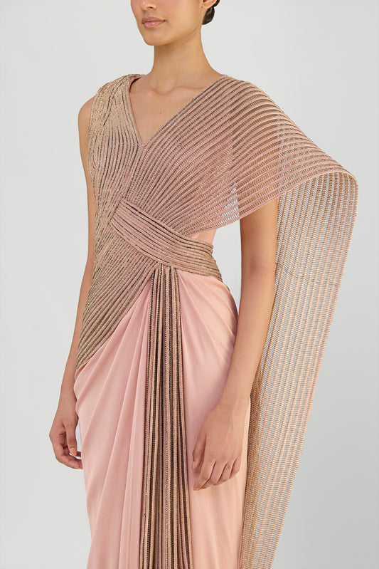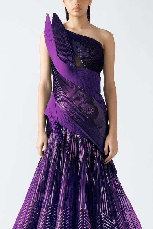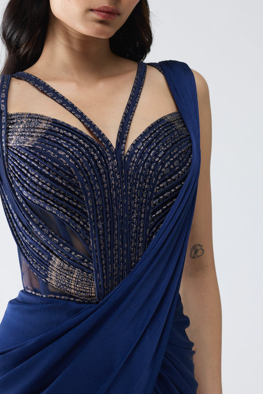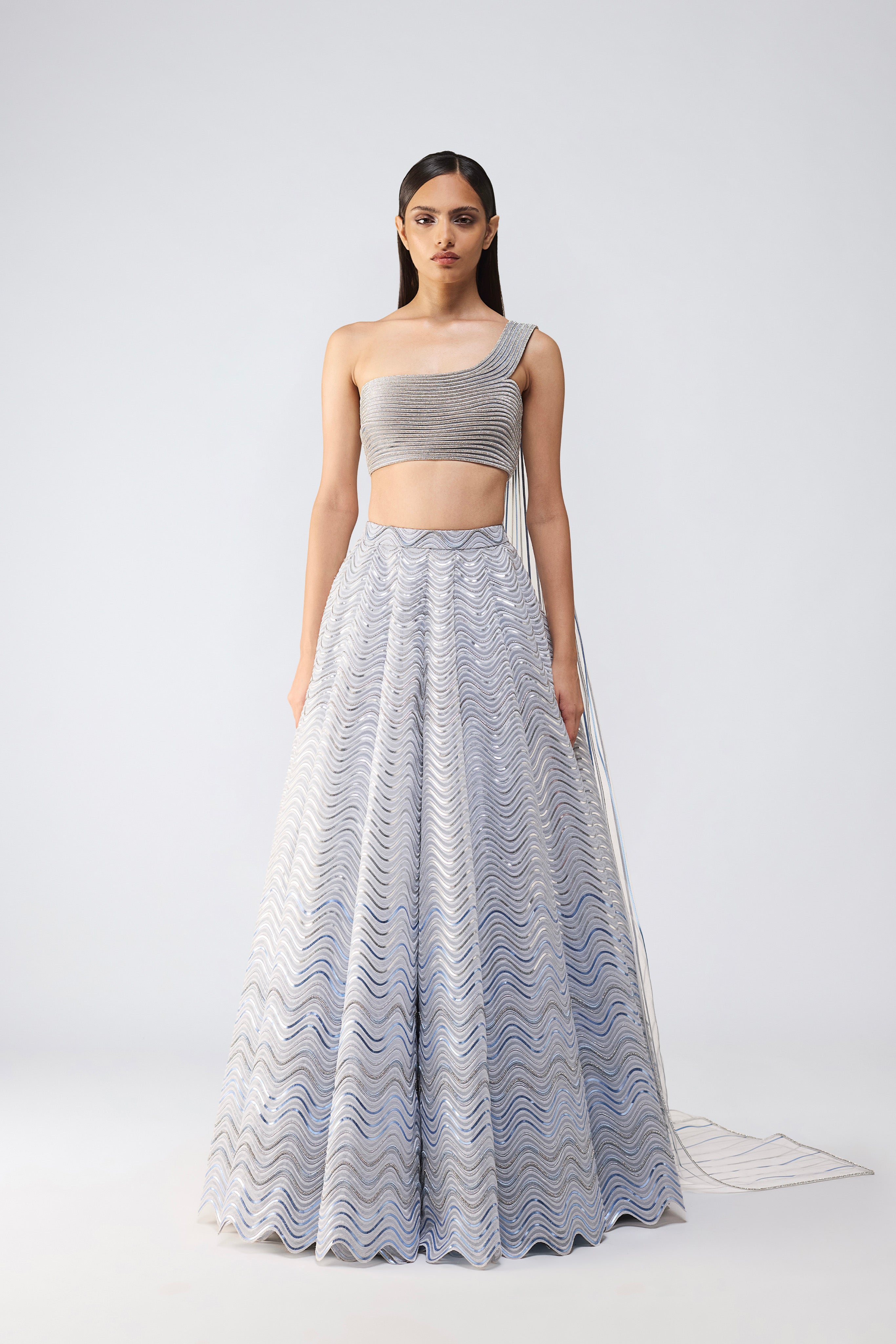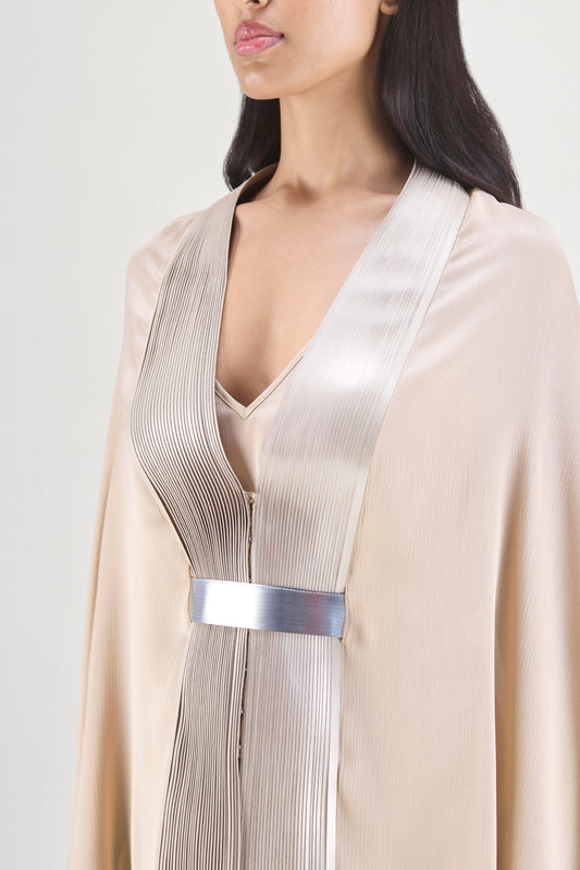 Metallic Fluted Tulle Skirt With A Beaded Halter Top And Crystalvein Drape