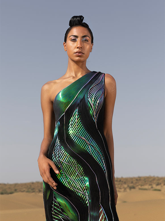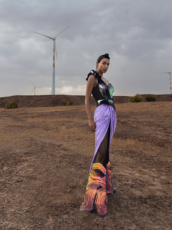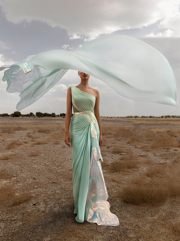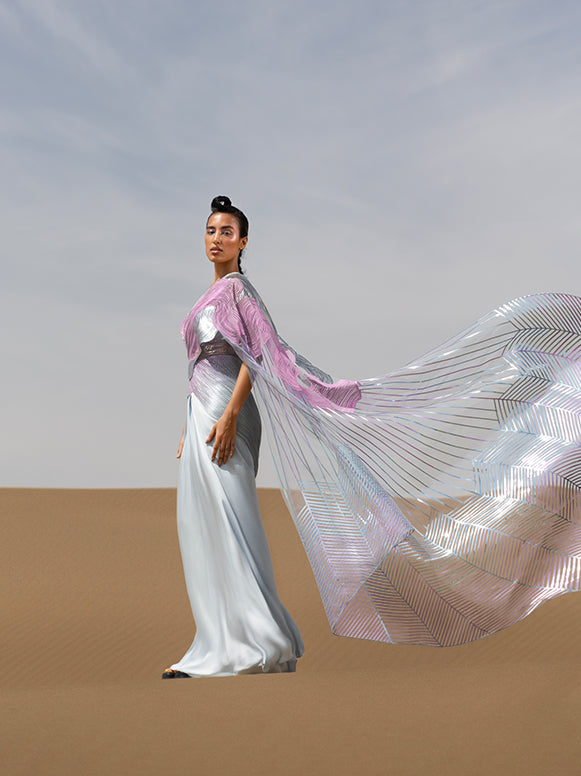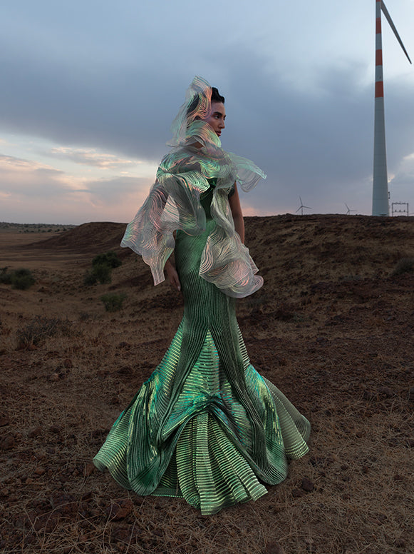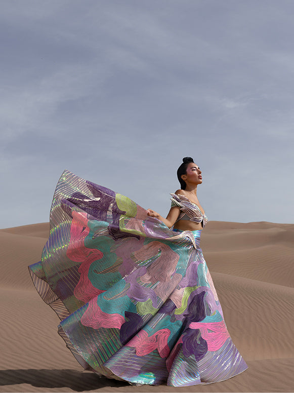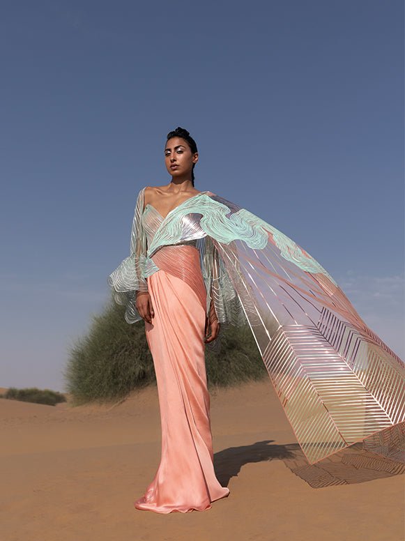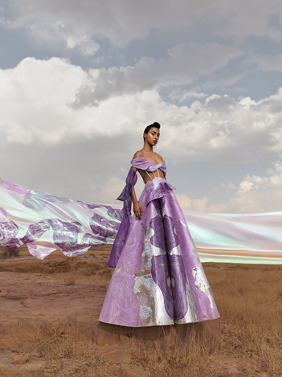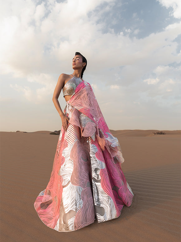 Flow is an ode to the different forms and shapes air can take. It embodies trusting the process and starting exactly at the point where you are now and learning to embrace the unique experiences on the journey and flow forward. For instance, a multi-coloured lehenga skirt becomes dynamic with air with an embossed air wave pattern and holographic detailing.