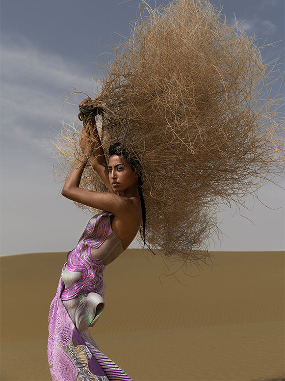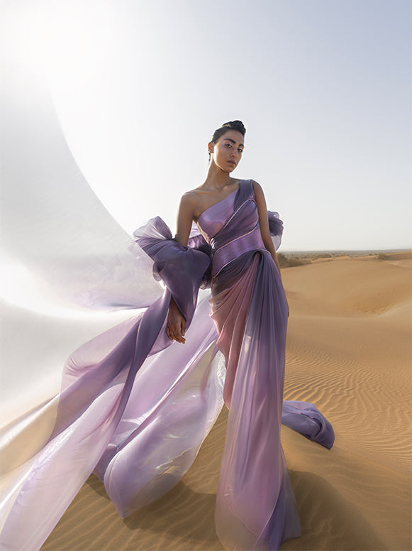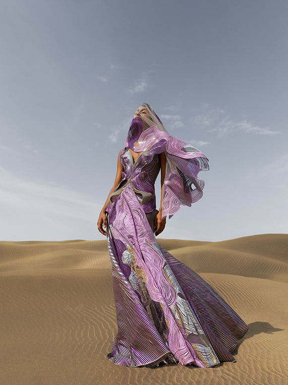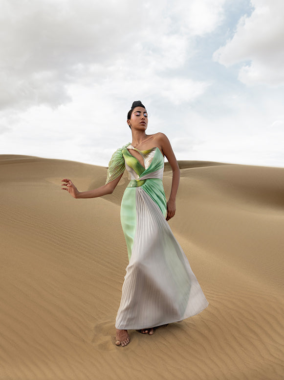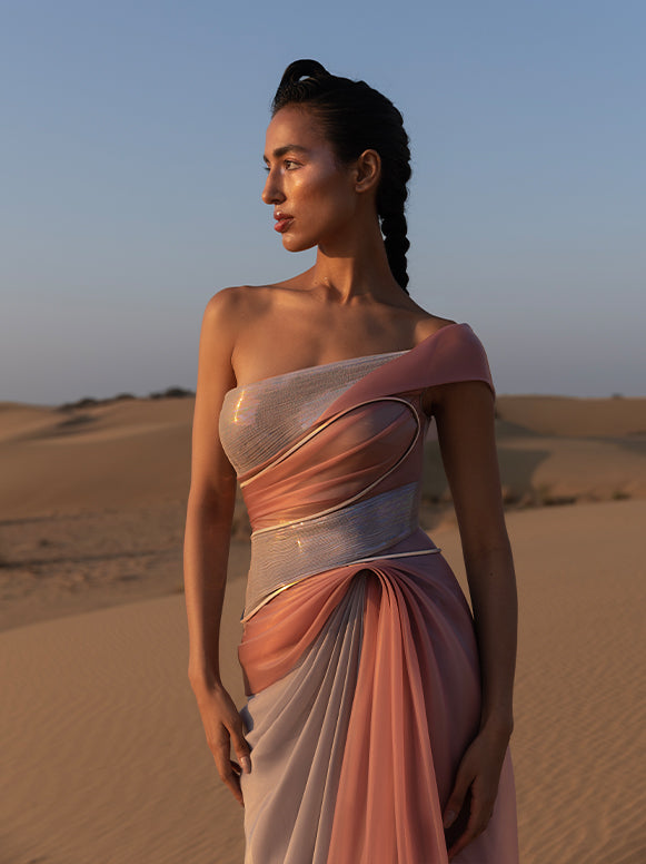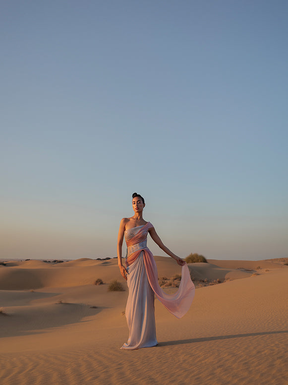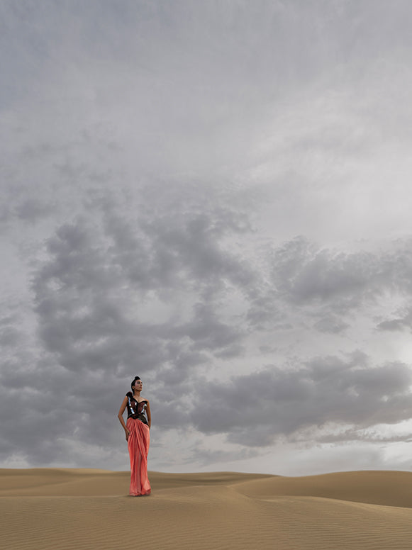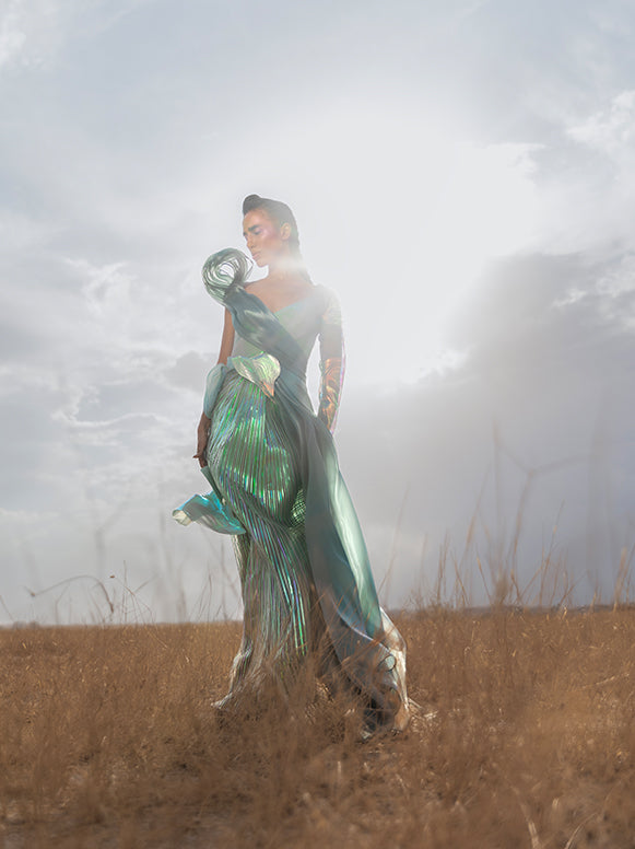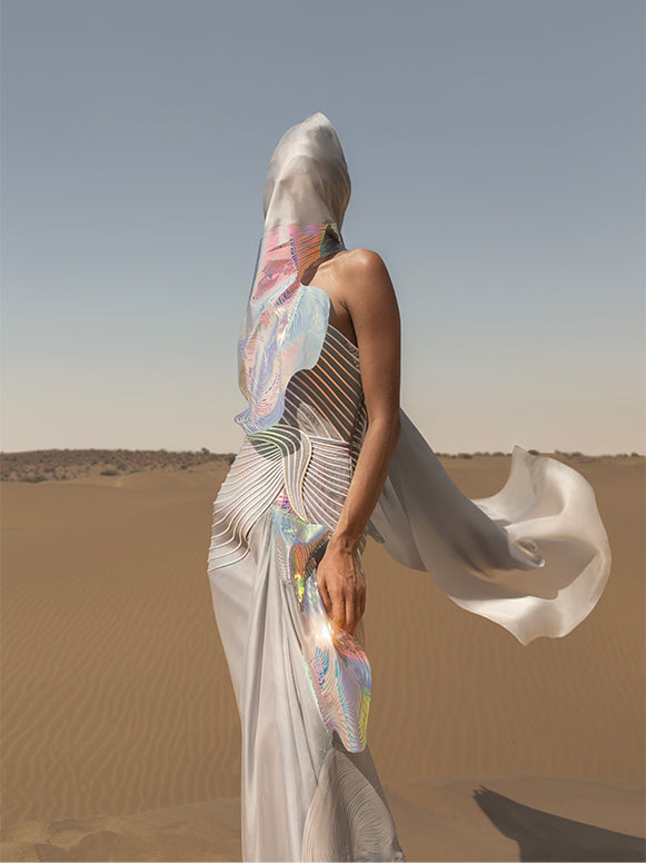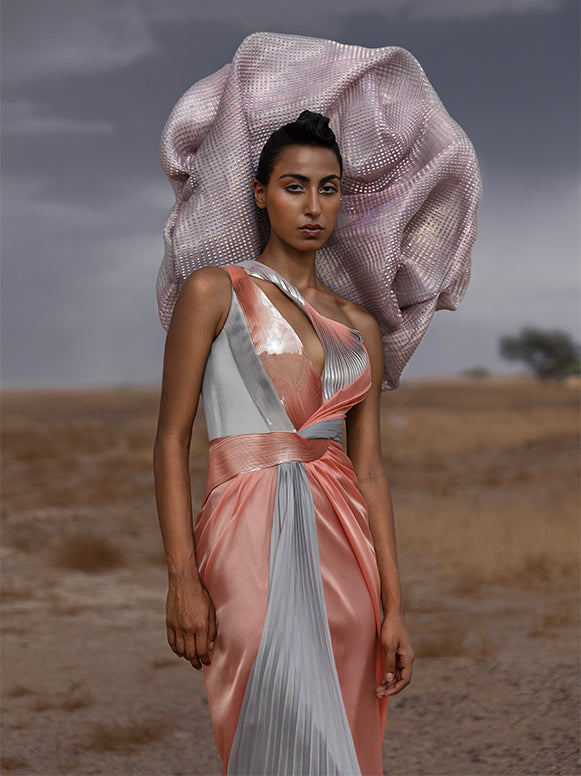 Flow is an ode to the different forms and shapes air can take. It embodies trusting the process and starting exactly at the point where you are now and learning to embrace the unique experiences on the journey and flow forward. For instance, a multi-coloured lehenga skirt becomes dynamic with air with an embossed air wave pattern and holographic detailing.