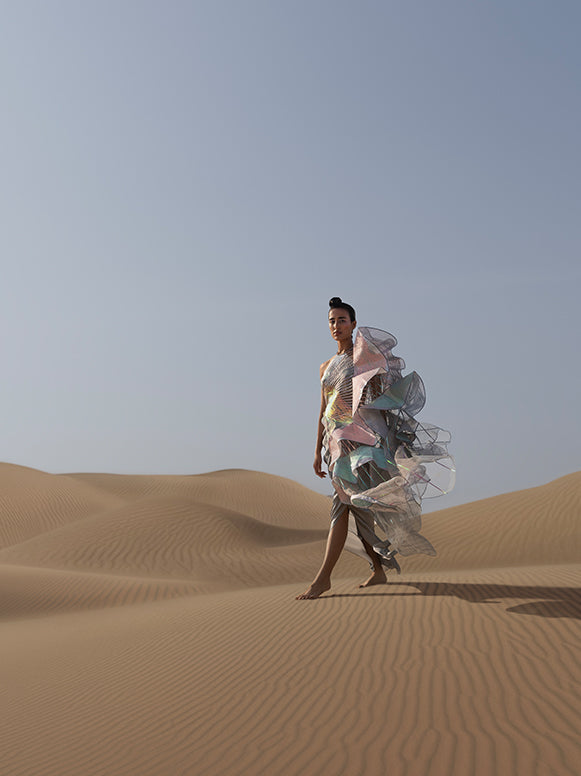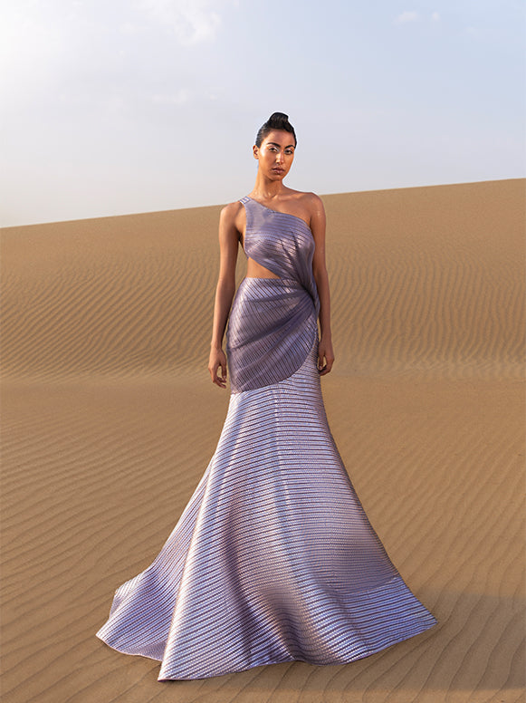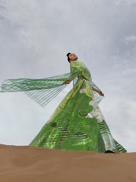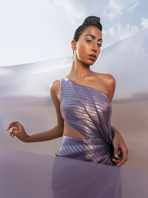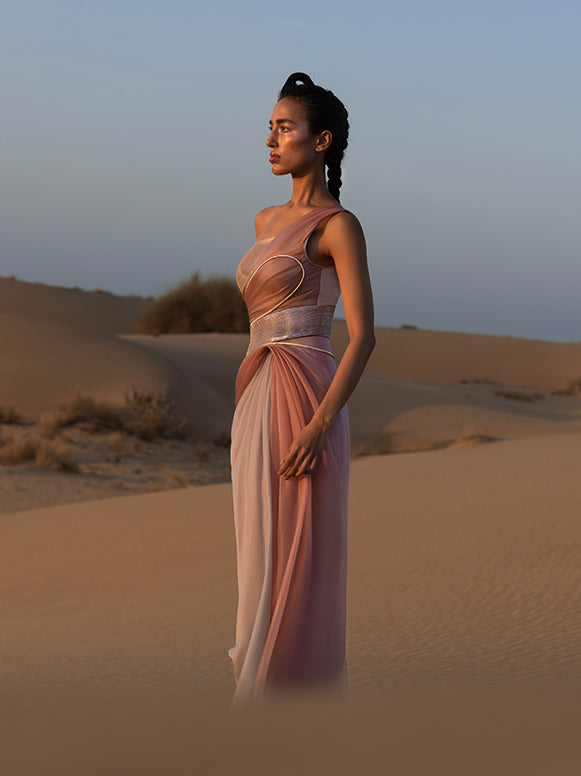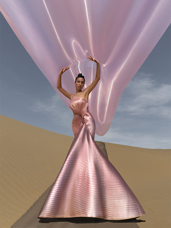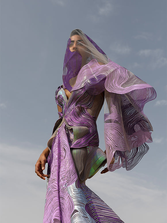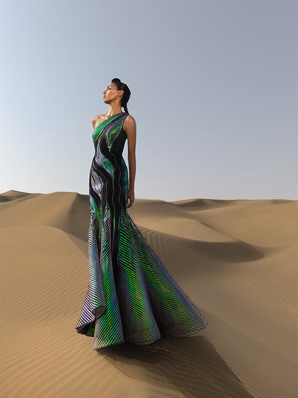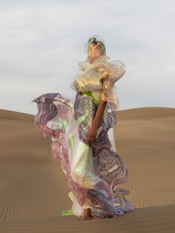 Flow is an ode to the different forms and shapes air can take. It embodies trusting the process and starting exactly at the point where you are now and learning to embrace the unique experiences on the journey and flow forward. For instance, a multi-coloured lehenga skirt becomes dynamic with air with an embossed air wave pattern and holographic detailing.