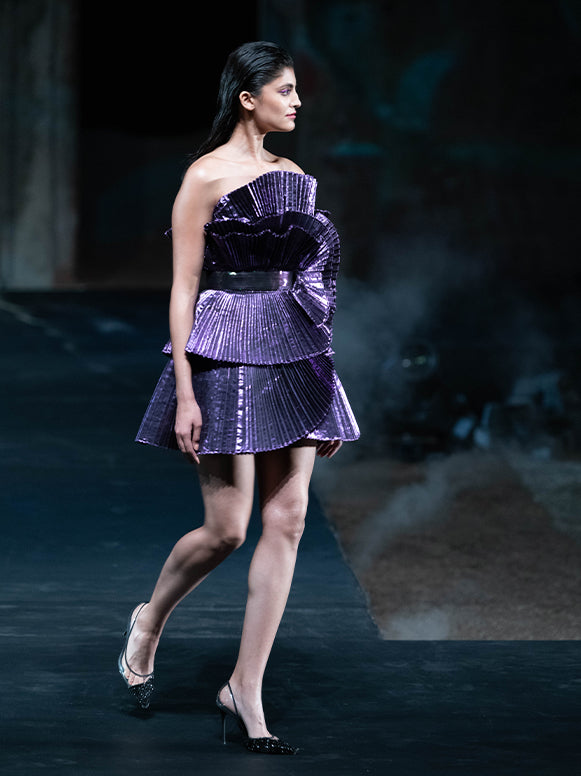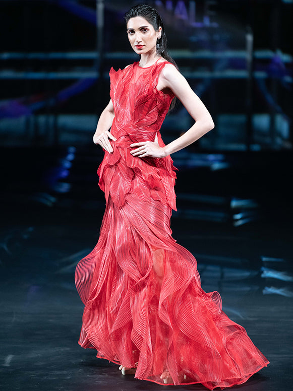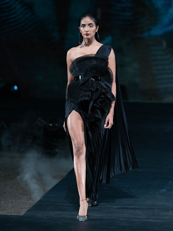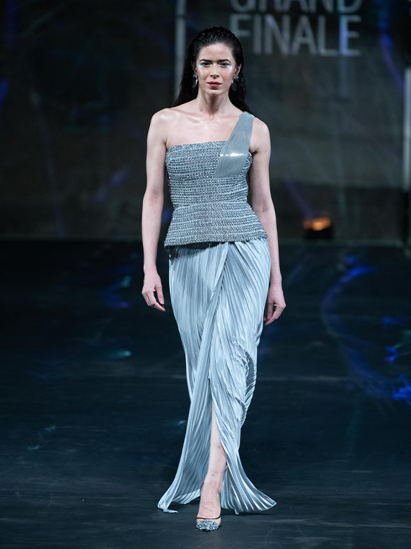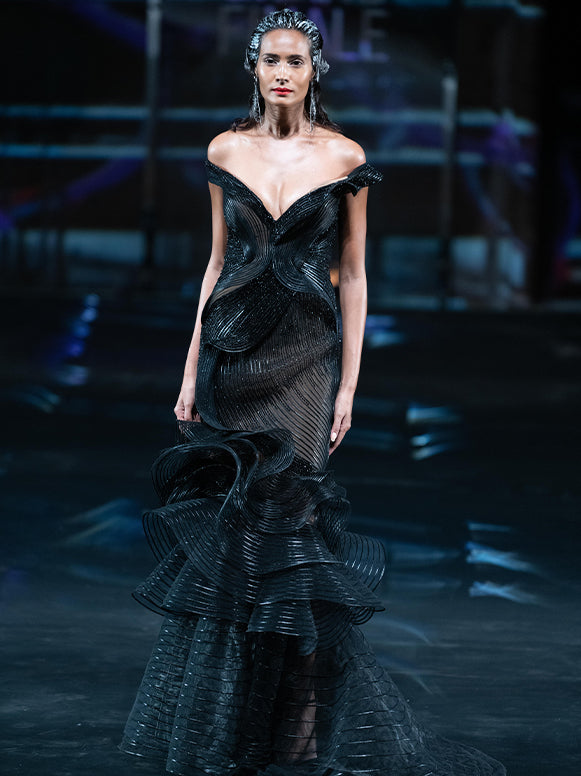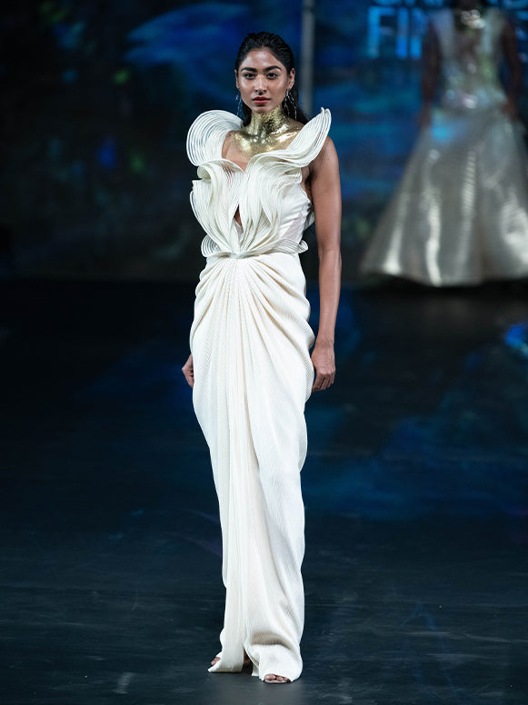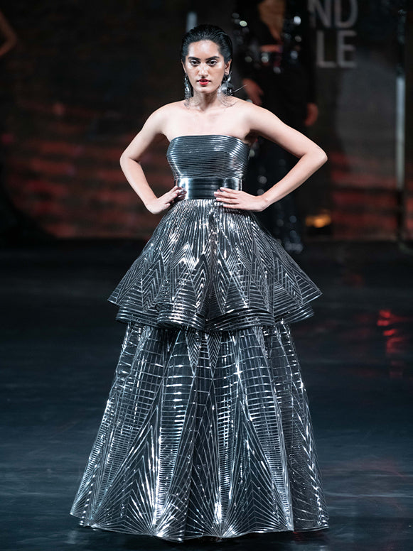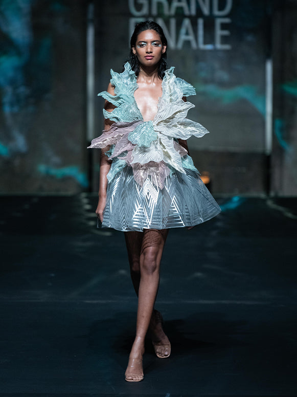 This collection is a step towards a future which we envision for human civilisation. For AXIL, we looked at the wildflower as a metaphor to represent femininity and how it conforms to a fabricated life made of concrete and polymers. All the pieces emanate the idea of a blooming flower thrown in industrial waste, and at the same time, mimic industrial aspects through hand-done techniques.