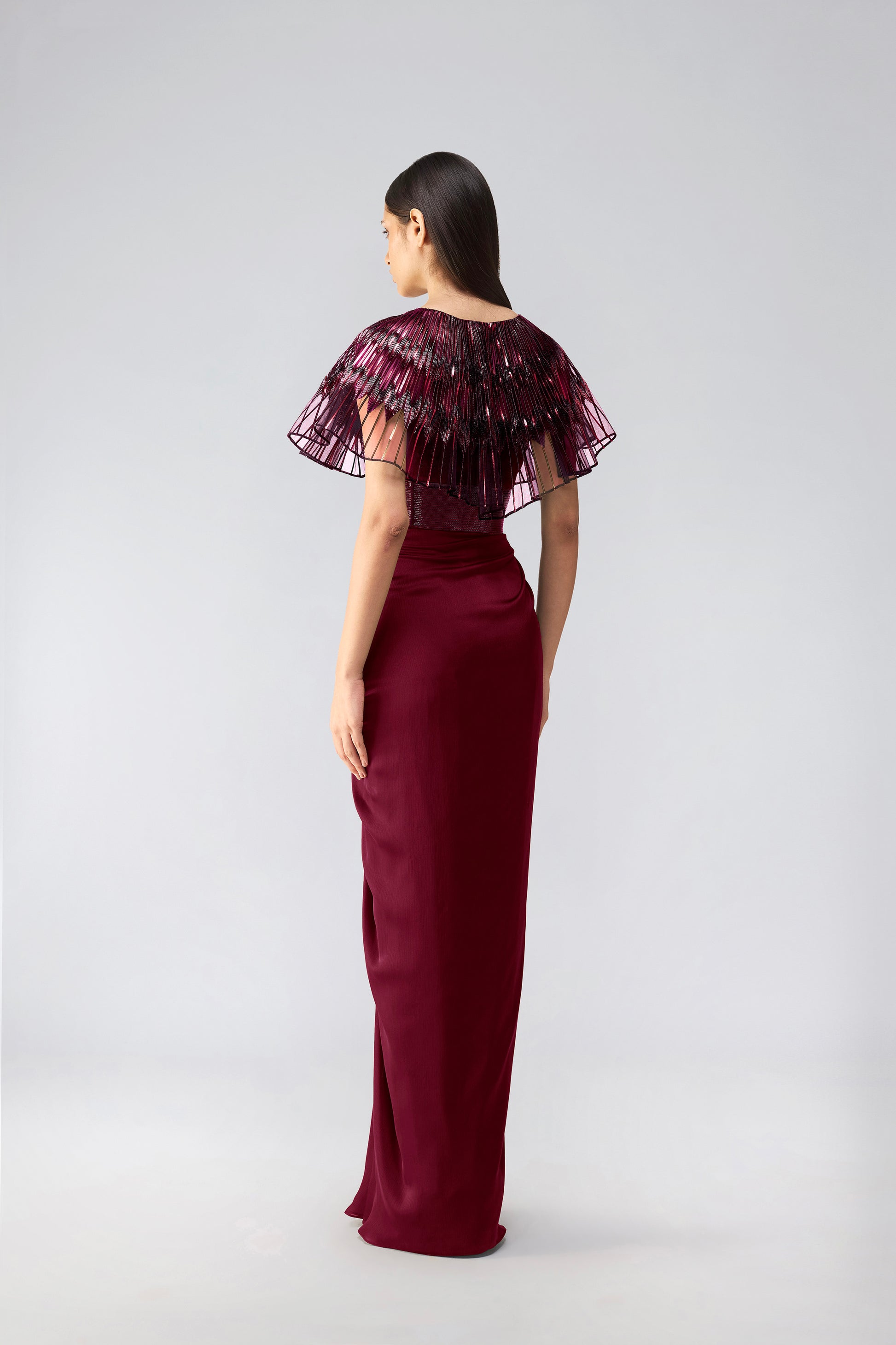 Metallic glitch cape gown in Tulle and Chiffon with glass beads and cording on waist