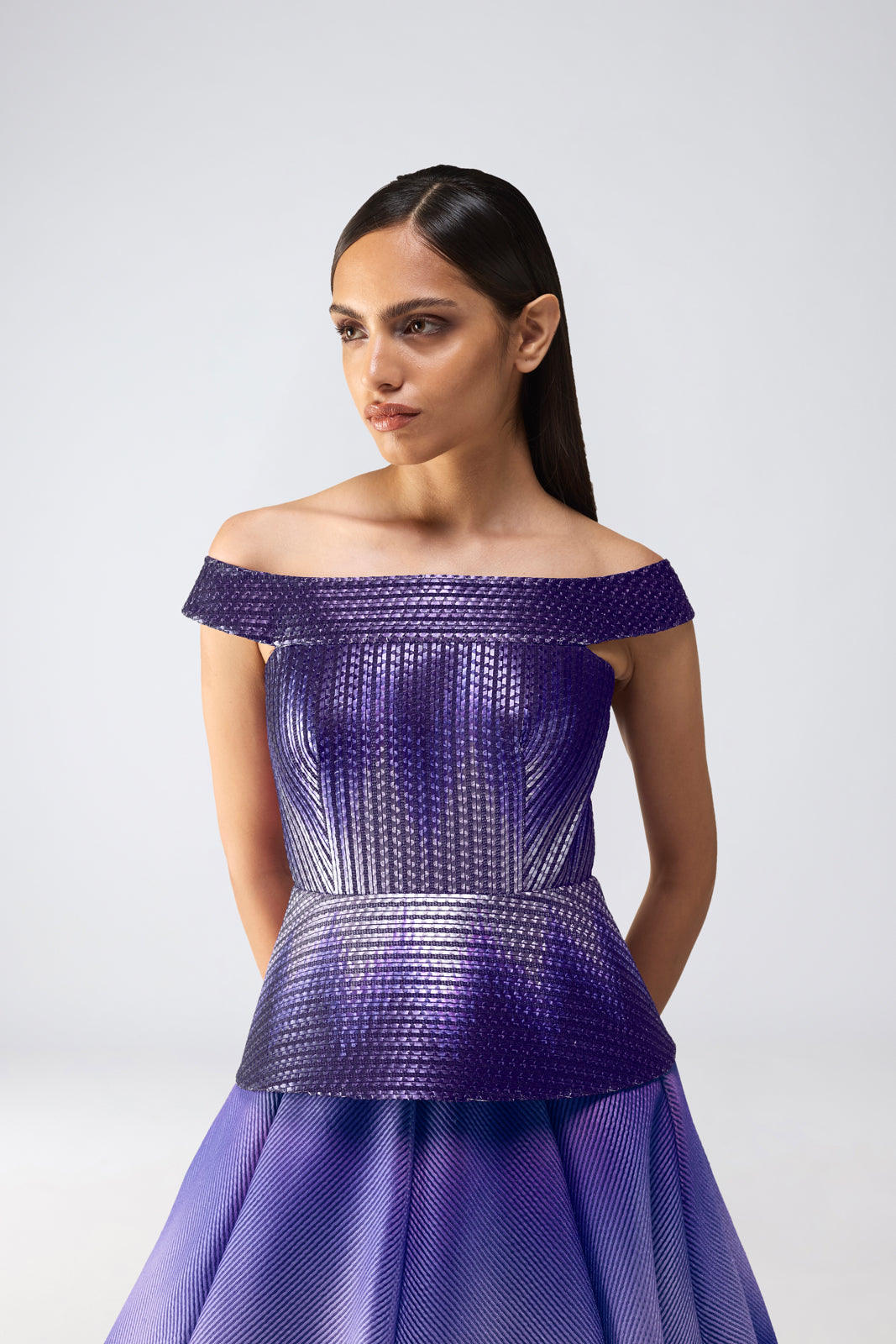 Metallic flared gown with hand-woven textile ombre glitch corset and an ombre fluted Tulle skirt