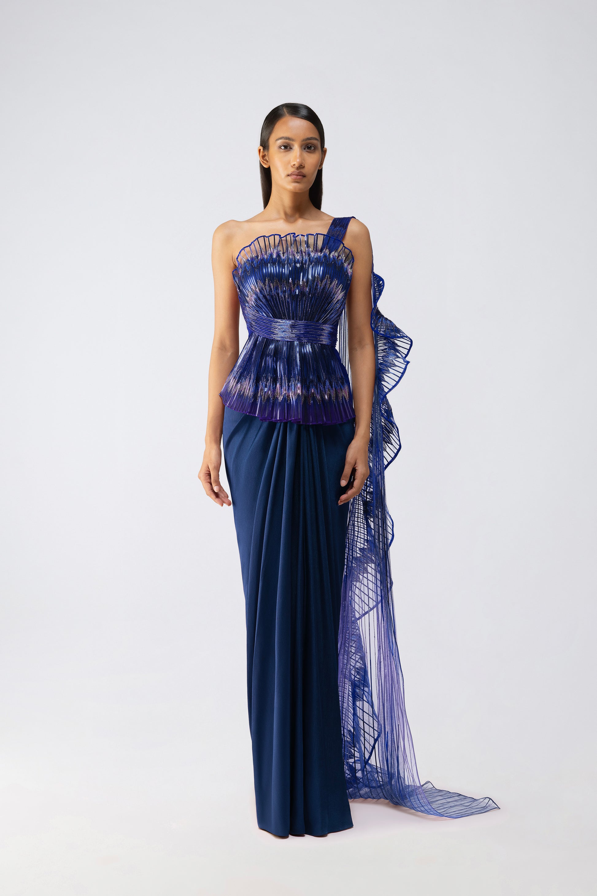 Metallic glitch gown in Satin Chiffon with a Tulle ruffle embroidered with glass beads