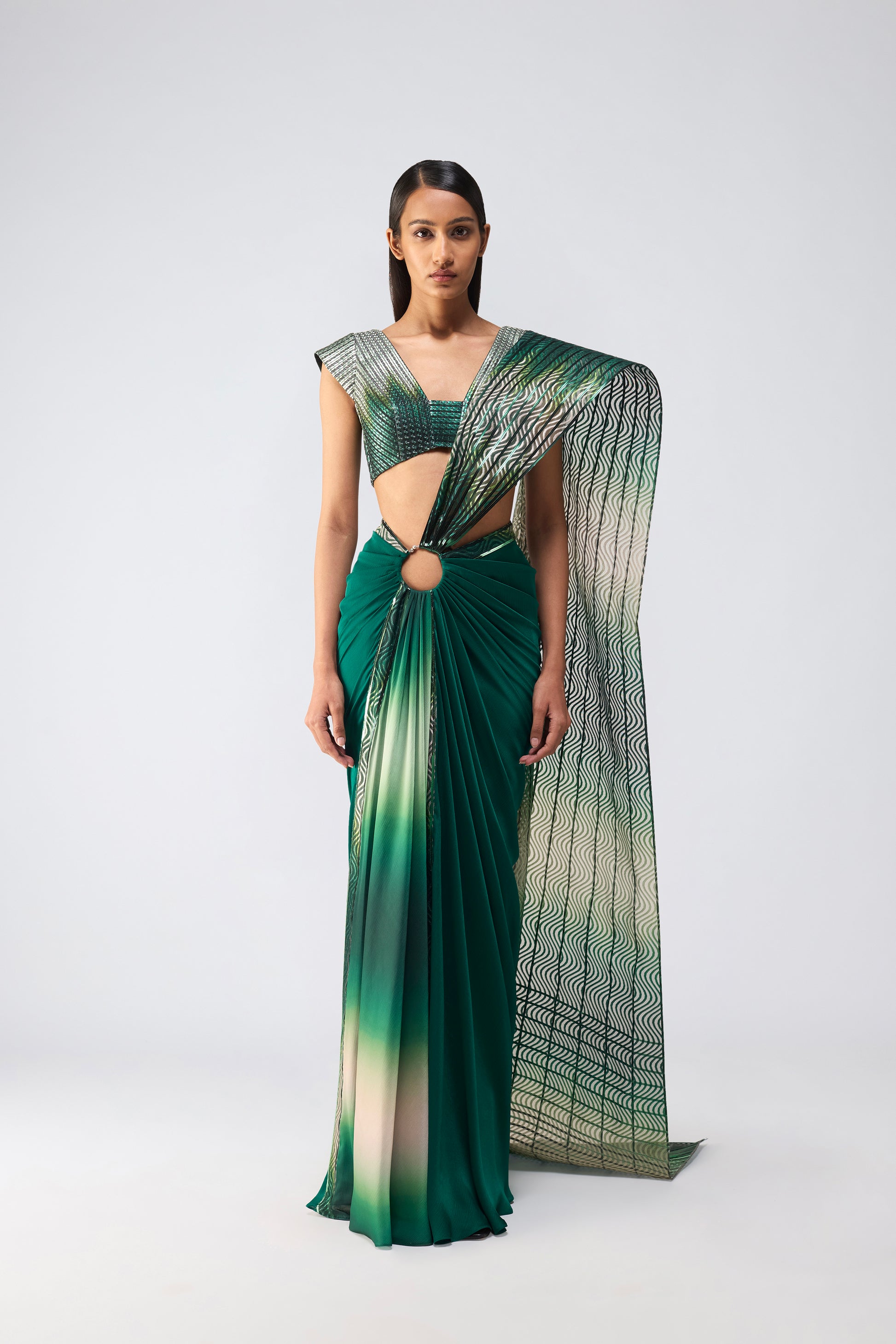Saree: Draped saree in Chiffon with glitch ombre panel in front and metallic wave glitch palla in fluted Tulle