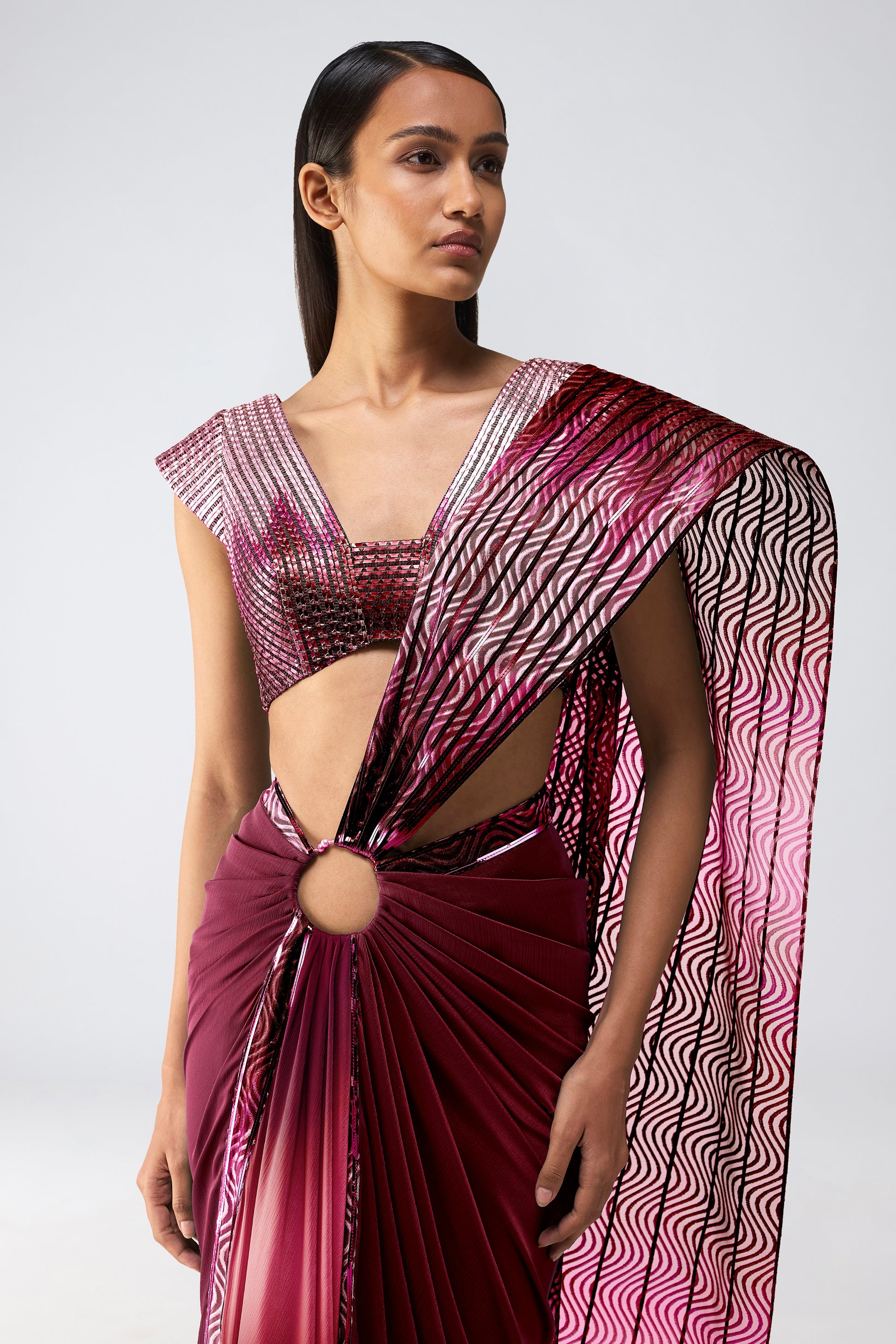 Saree: Draped saree in Chiffon with glitch ombre panel in front and metallic wave glitch palla in fluted Tulle
