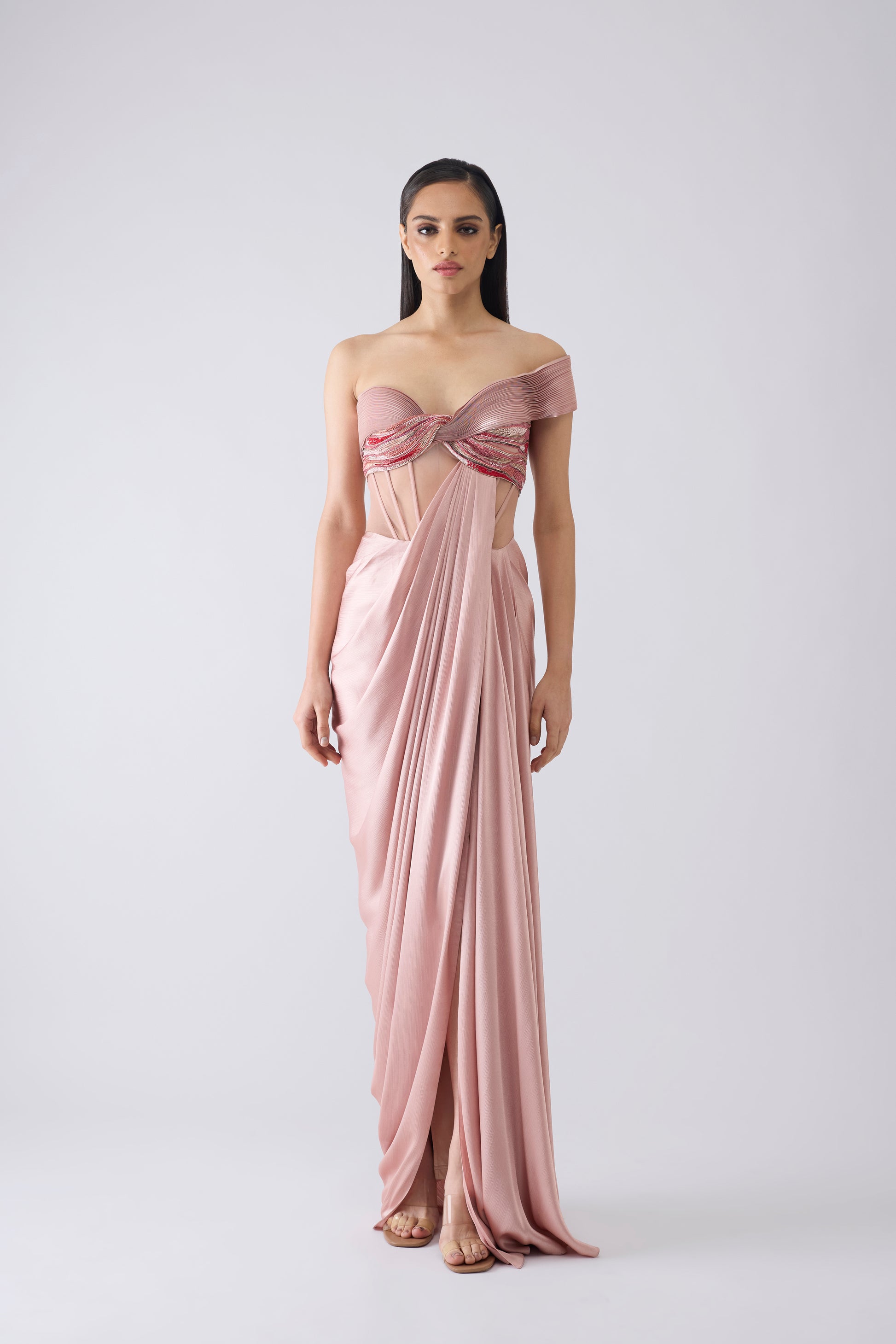 Moulded metallic micro pleated gown with glass beads in satin chiffon .