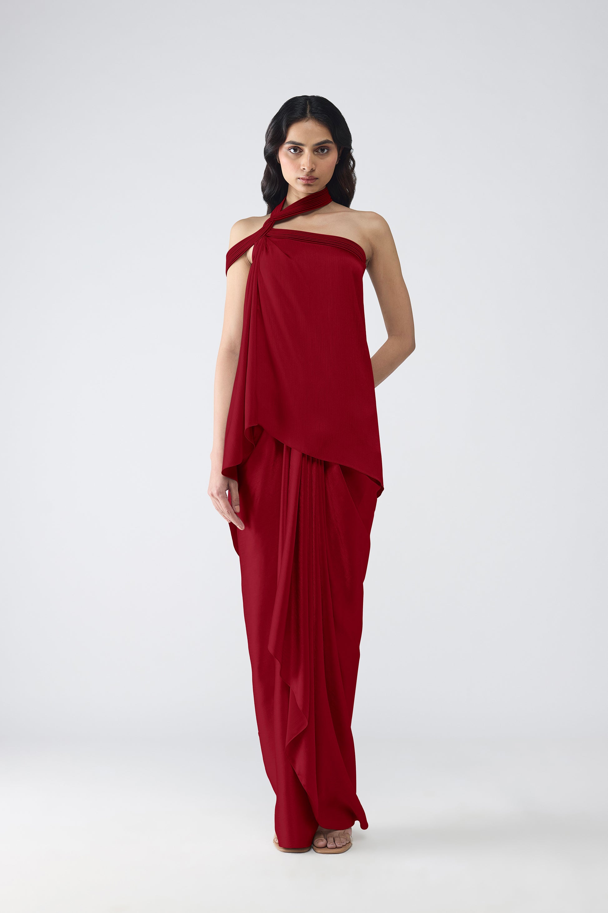Fluid micro pleated halter Top with draped skirt in Satin Chiffon.