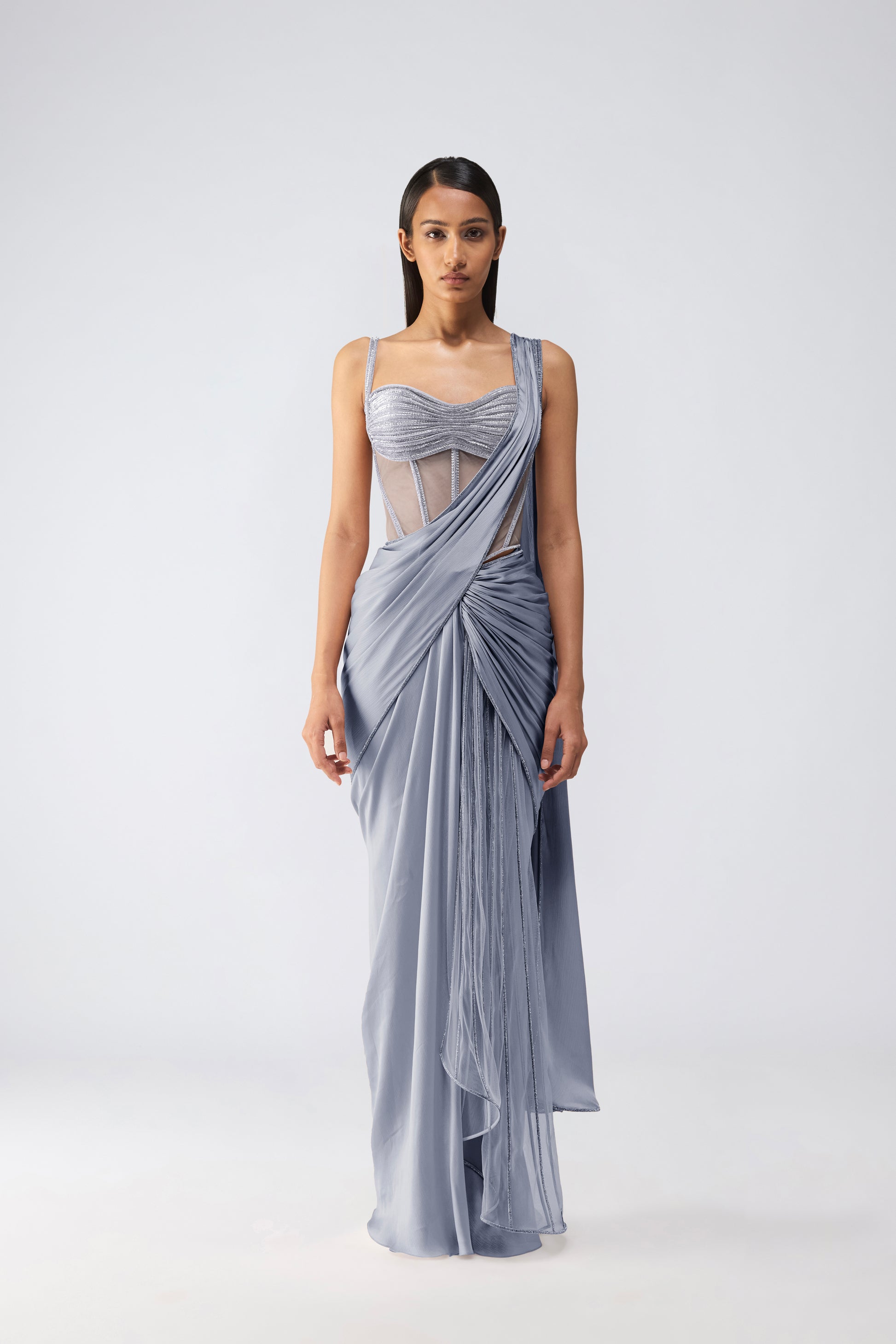 Saree: Draped saree in Satin Chiffon with a crystalvein front drape in Tulle