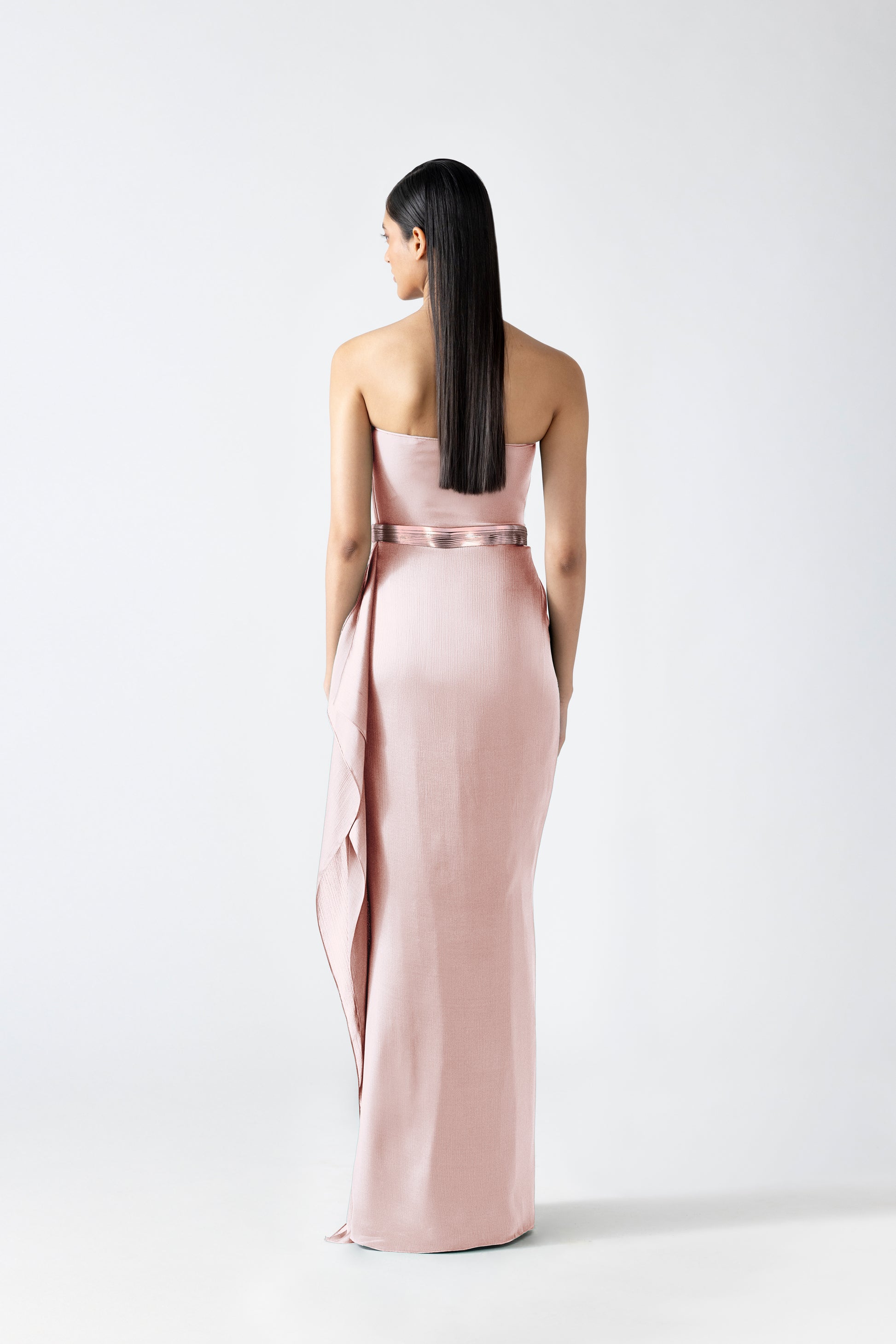 Moulded metallic micro pleated off the shoulder gown with a Chiffon drape on skirt.