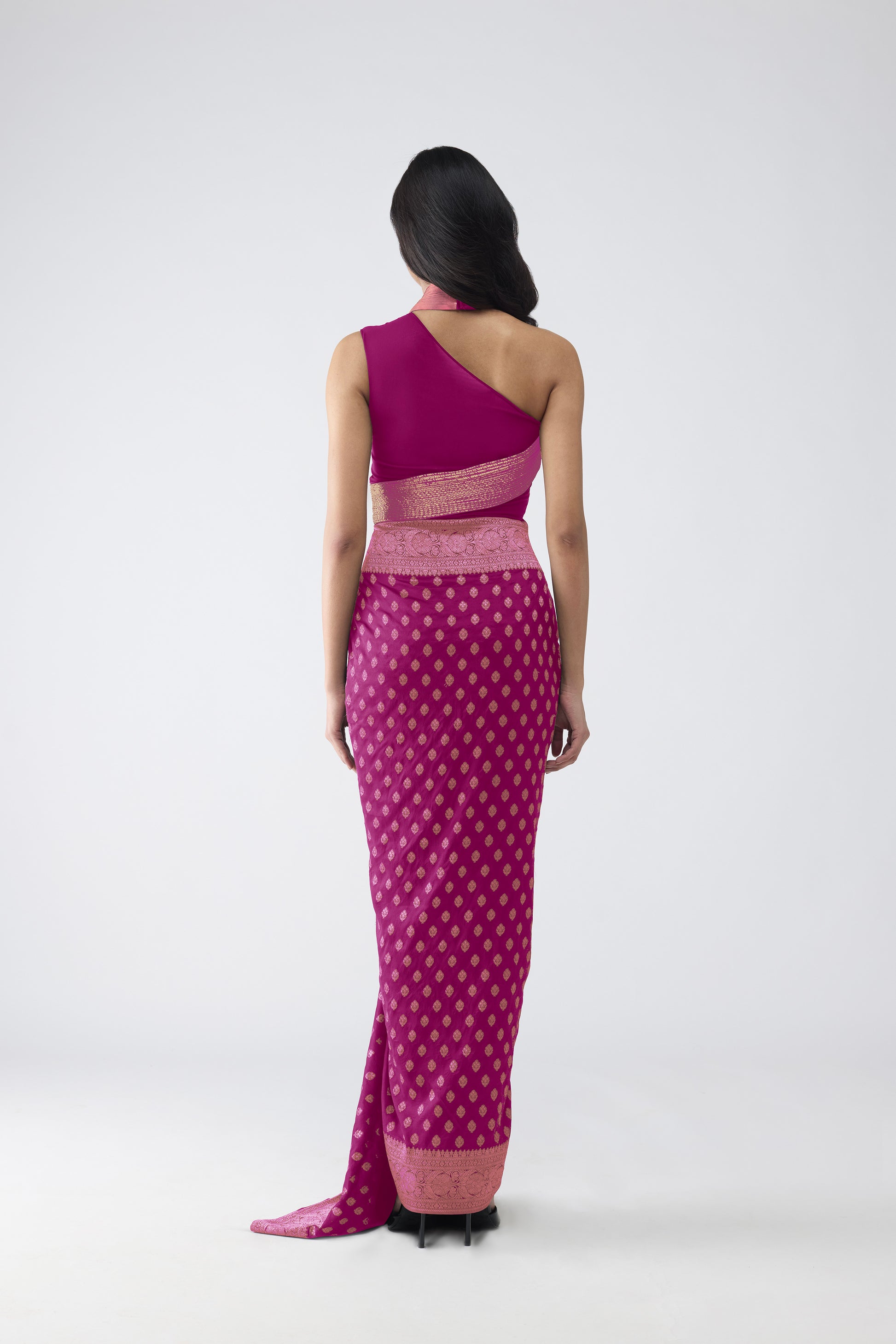 Moulded metallic micropleated gown with a vintage Banarsi draped skirt.